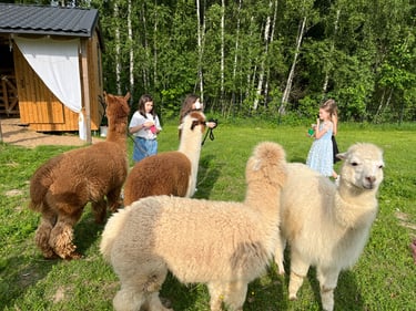 7 alpakos ir 3 mažosios ožkytės - prijaukintos, švelnios ir prižiūrėtos.